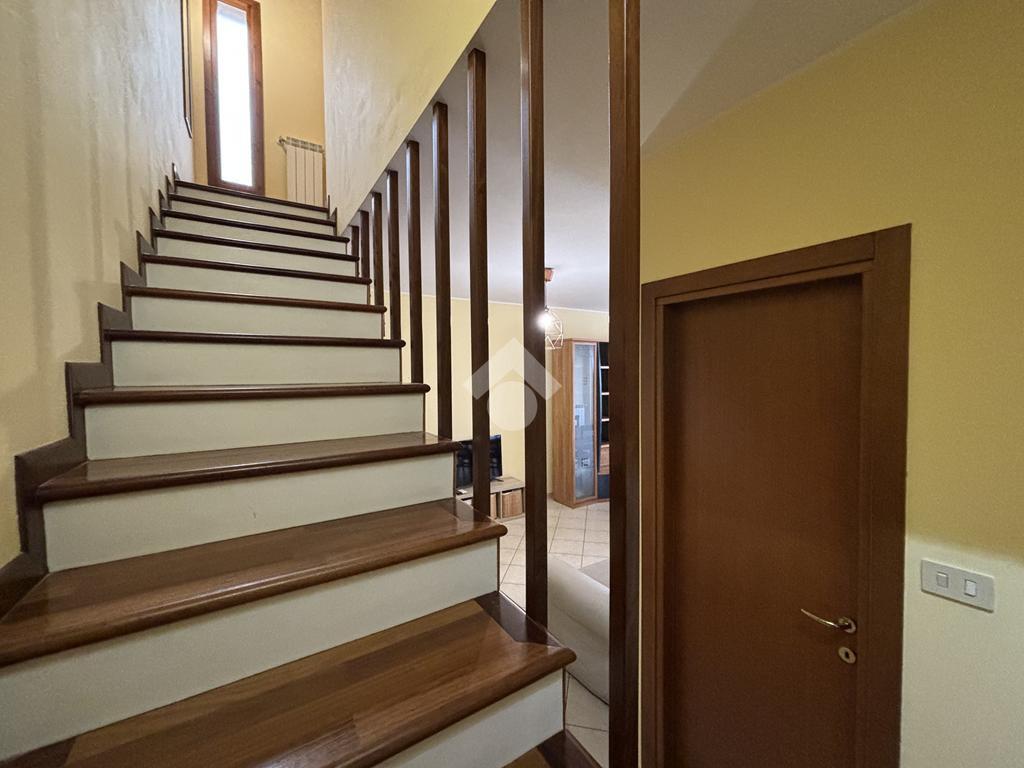 Una scalinata interna conduce al piano superiore, costituito da un luminoso disimpegno, tre camere da letto ed un bagno completo di doccia e vasca.