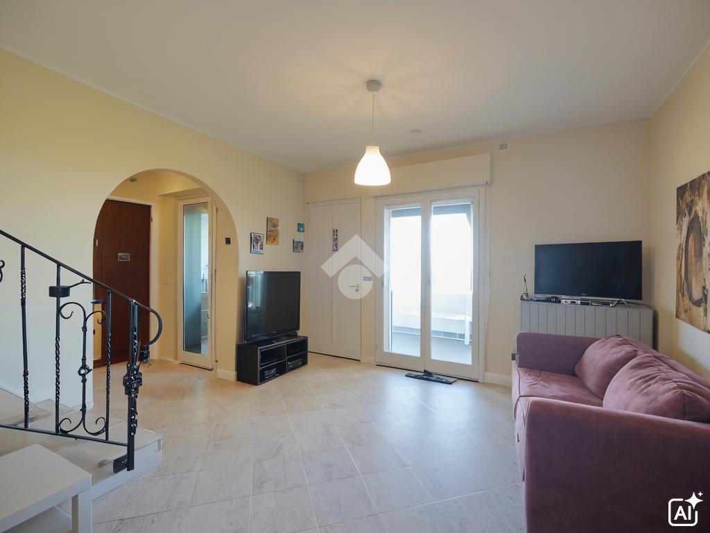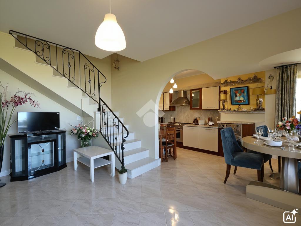 Un terrazzo con suggestiva vista mare introduce il piano primo, composto da un luminoso soggiorno, una cucina ed una pratica dispensa. Tramite un disimpegno con armadio a muro si accede alla zona notte, con due ampie camere da letto e due bagni, completi di doccia e vasca. Una scalinata interna conduce al piano secondo, costituito da una camera da letto con balcone privato, uno studio ed un ulteriore bagno con doccia. Completa il piano un comodo terrazzo abitabile. Annessi alla proprietà, al piano terra, un garage ed un piccolo giardino privato.