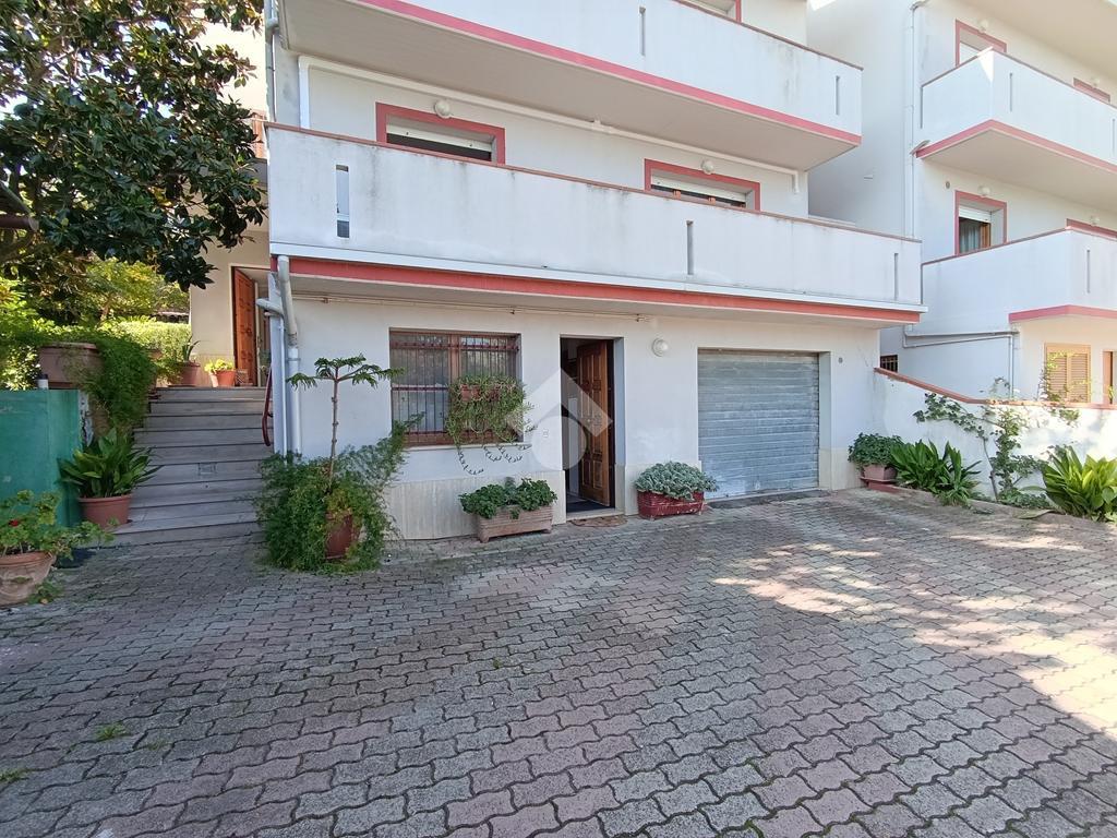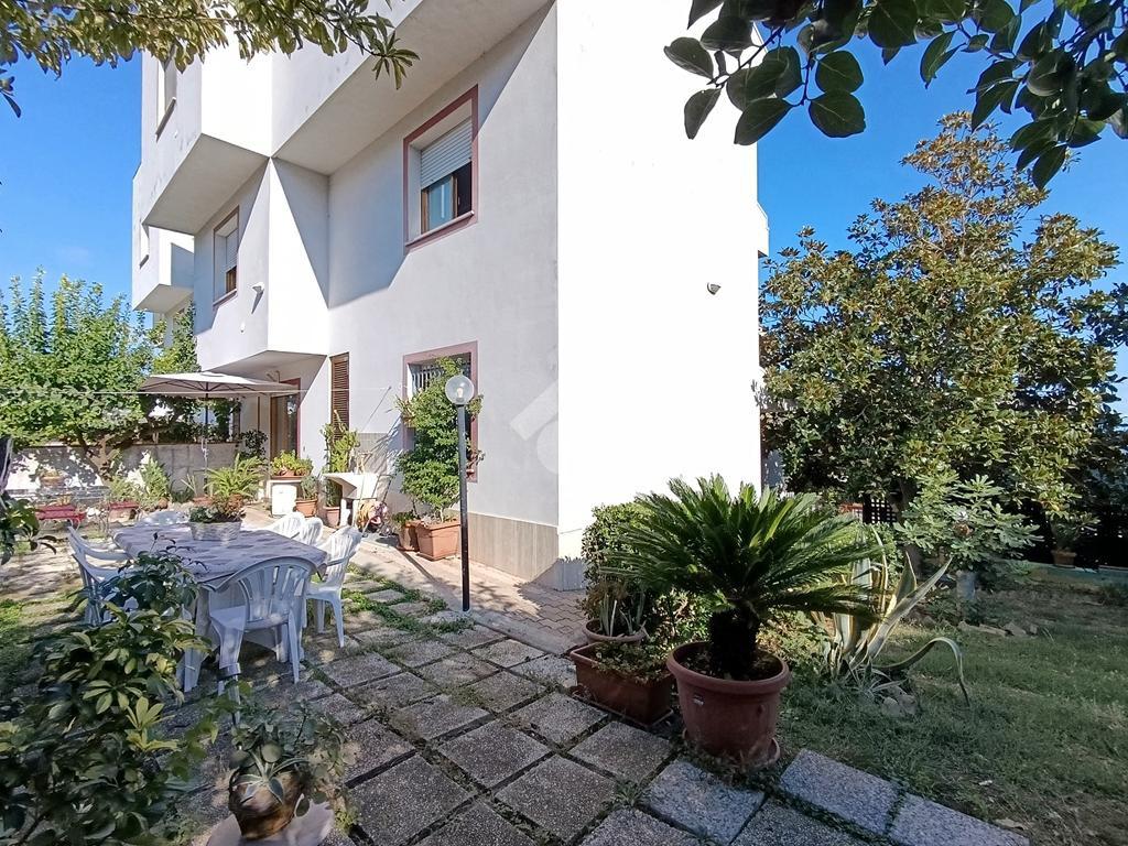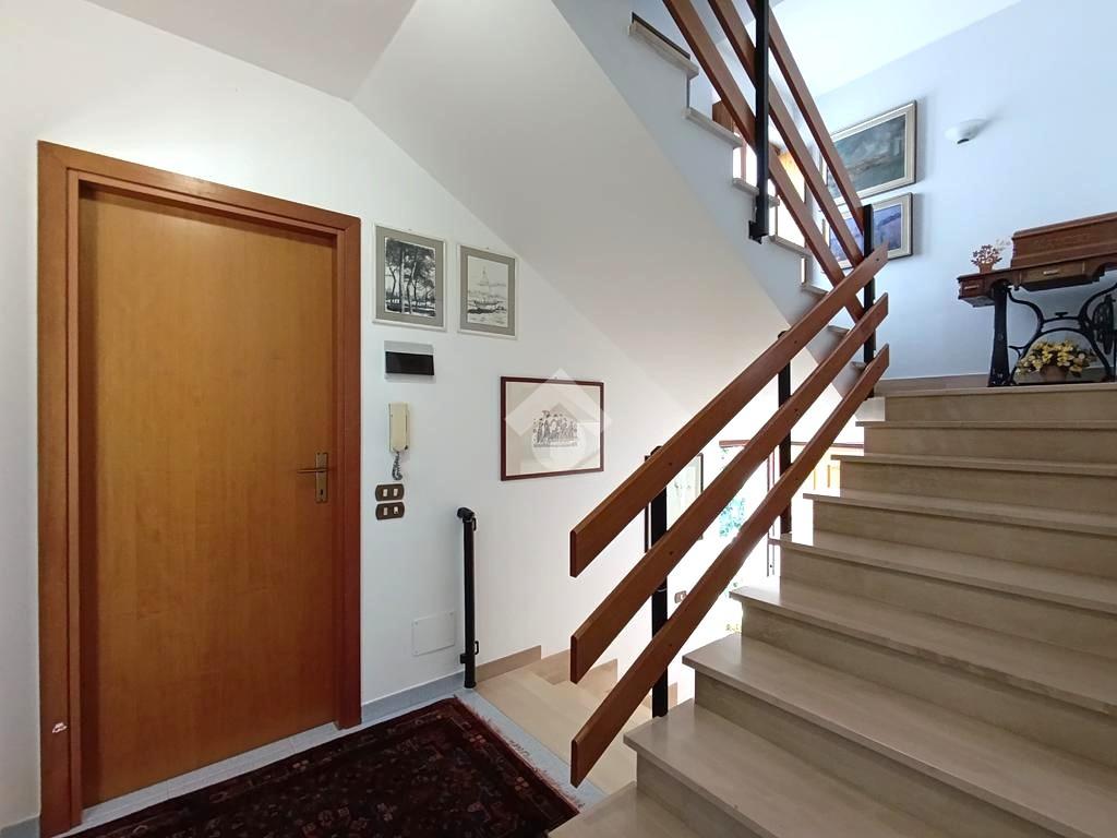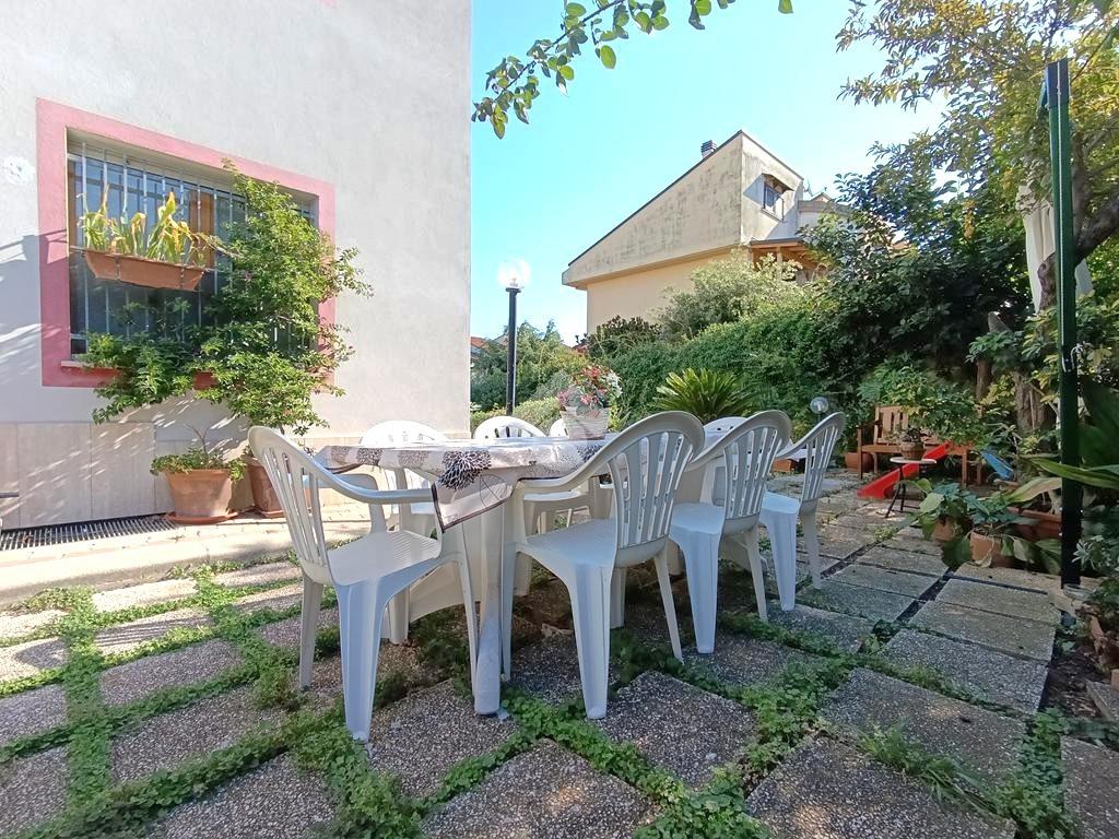 Una corte esterna privata di circa 300 mq introduce la proprietà, composta al piano rialzato da una cucina abitabile con camino, un luminoso soggiorno con uscita sul giardino, un ampio balcone abitabile a servizio di entrambe le stanze ed un bagno. Tramite una scalinata interna si raggiunge il piano primo, costituito da tre spaziose camere da letto ed un bagno con vasca e doccia. Completa il piano un balcone con suggestiva vista mare. Al piano secondo la soluzione dispone di due ulteriori vani e di un bagno con doccia. Completano l'immobile, al piano seminterrato, una rifinita taverna con servizio, cantina, ripostiglio ed un ampio garage, collegati internamente tramite una scalinata.