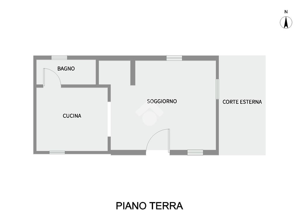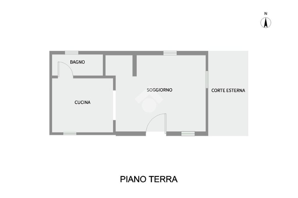 Al piano terra la soluzione si compone di un ingresso, un luminoso soggiorno con angolo cottura ed un bagno con vasca. Completa il piano una corte esterna privata e recintata.
